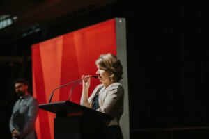 Natasa Aster-Stater, 2025 Director of W’SUP News, announcing Léane Debize’s award, by Olga Nebot.